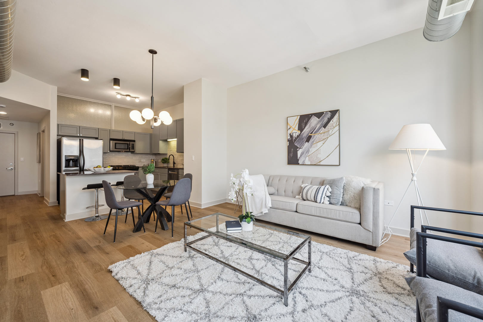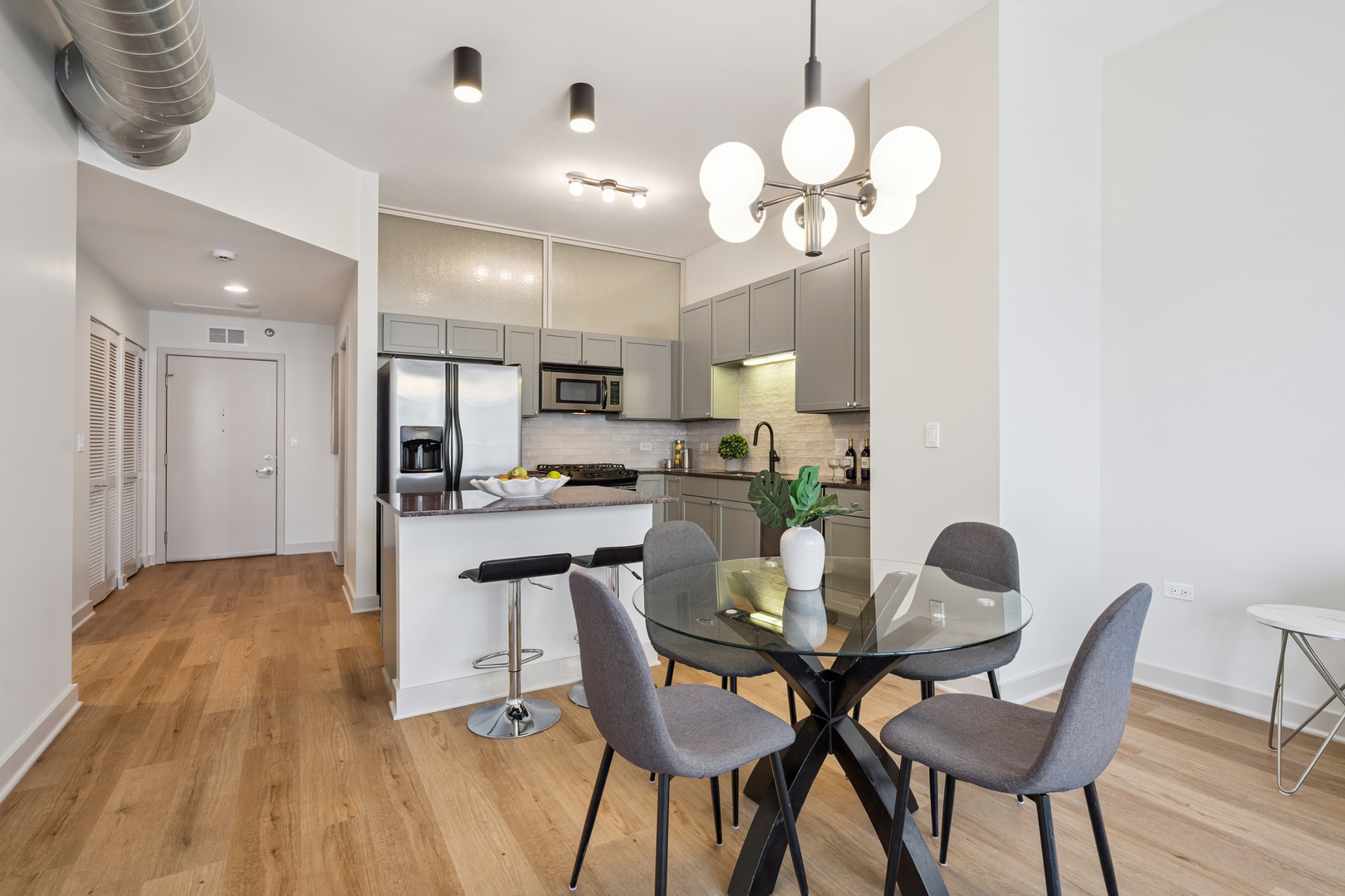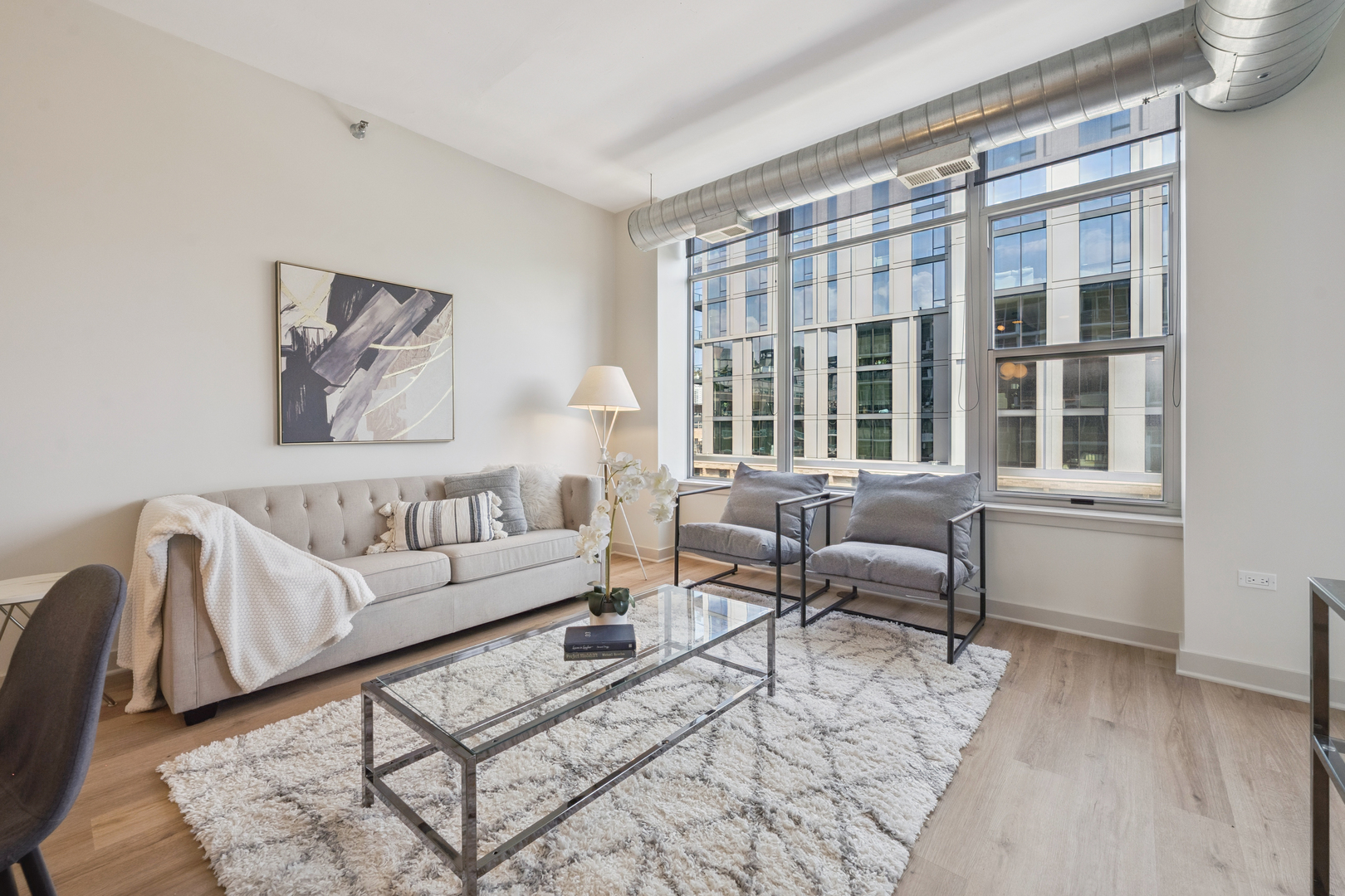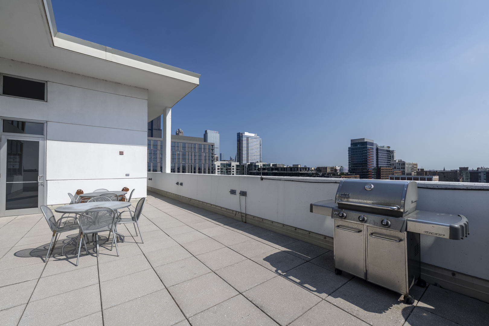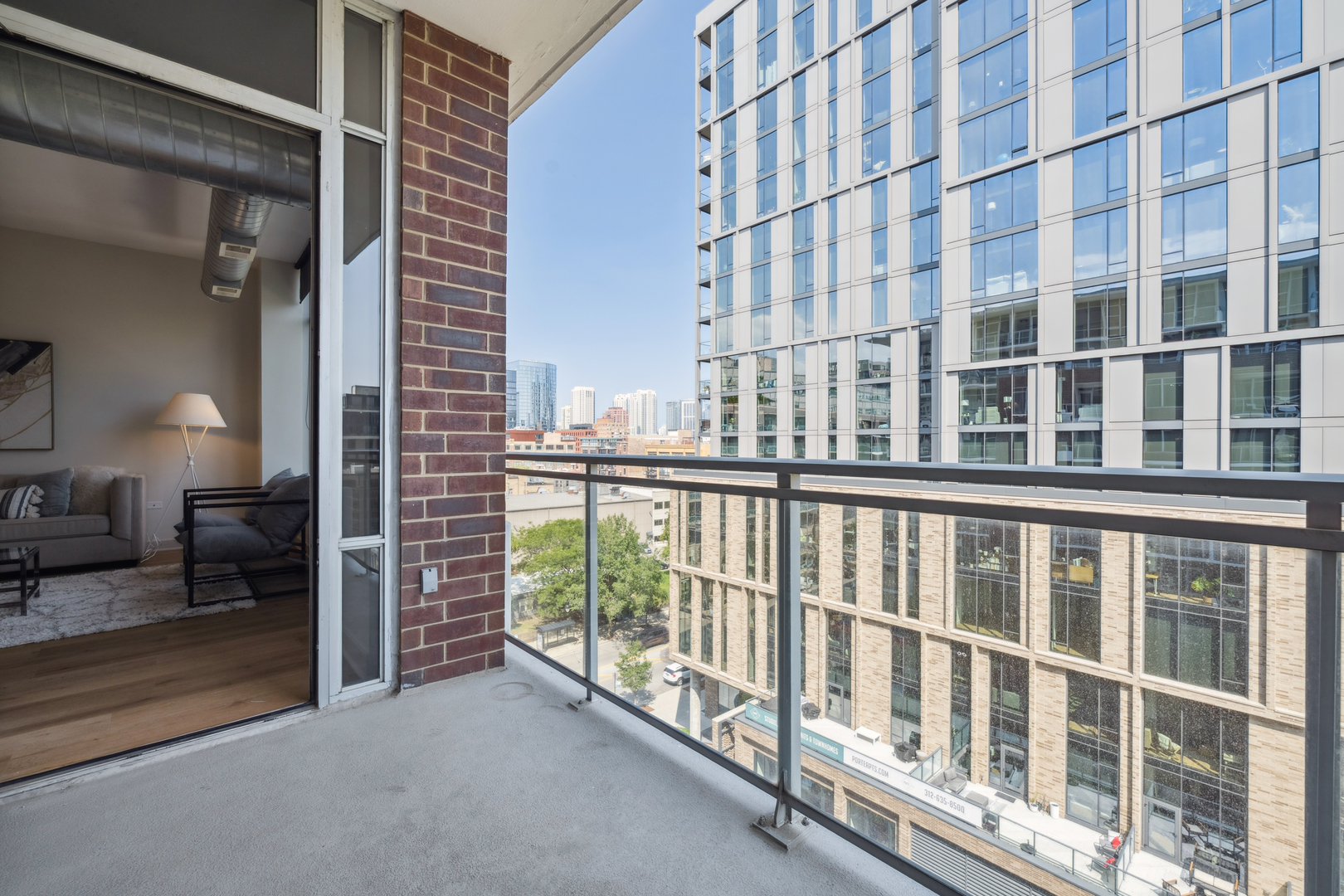 Experience breathtaking East skyline views from this highly desirable 2 Bed / 2 Bath + DEN, offering 1,430 sq. ft. of sophisticated city living in one of Chicago's most sought-after neighborhoods. Start your day with coffee or unwind in the evening on your private balcony, taking in the city lights. Recently refreshed, this home features brand new flooring in the main living areas, new carpet in both bedrooms, and fresh paint throughout. The kitchen has been updated with sanded and painted cabinets and a stylish new backsplash, adding a modern touch to the open-concept design. Floor-to-ceiling windows flood the space with natural light, complemented by granite countertops and 42" cabinetry. The versatile den offers the perfect spot for a home office, workout space, or creative studio. The spacious main bedroom easily accommodates a king bed, includes a walk-in closet, and features a spa-inspired bath. The building's upscale amenities include a state-of-the-art fitness center, party room, sun/roof deck, bike room, and attentive front door staff. Residents also enjoy a beautifully landscaped 4th-floor terrace with outdoor seating, grilling stations, and a dog run. Step outside and immerse yourself in all that the West Loop has to offer - from world-class dining along Restaurant Row to boutique shopping, trendy coffee houses, art galleries, and nightlife. Enjoy a proximity to Bartelme Park, SOHO House, Whole Foods, Randolph Street Market, the Fulton Market District, and nearby CTA and expressways for a quick commute, Union Station and Ogilvie Transportation Center, Located in the esteemed Skinner School District, this property offers access to one of Chicago's top-rated public schools, providing added value for families and potential long-term investment opportunities. The unit features a storage locker, and deeded garage parking is available for an additional $30,000.